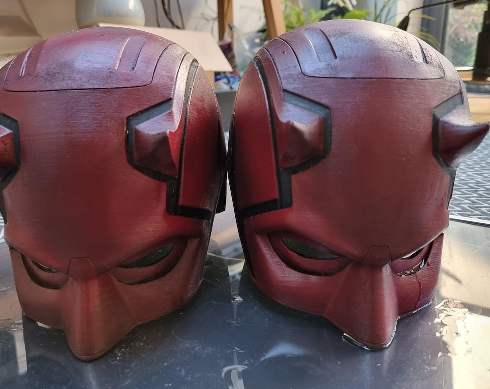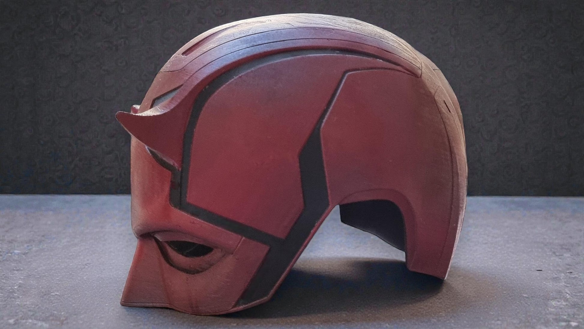 A bold crimson vigilante-style mask designed for cosplay, display, or photoshoots. This full helmet cowl features a striking comic-inspired silhouette with sharp contours and a dramatic red finish.